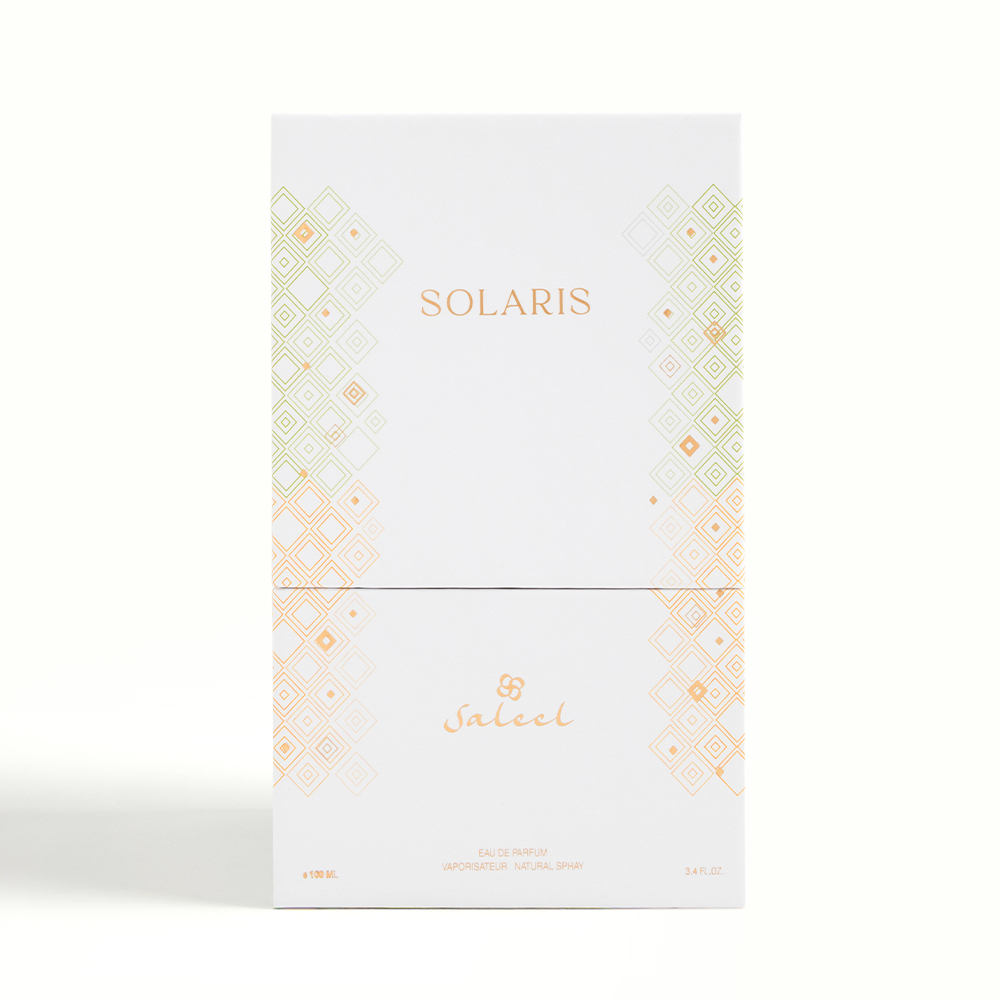 Saleel Solaris is an indulgent ode to sunlight and sweetness. The fragrance opens with a delicious medley of orange, raspberry, peach, coconut, caramel, and chocolate - a gourmand fantasy that instantly captivates the senses. The heart reveals a floral embrace of tuberose and jasmine, softened by the smoothness of white wood and sandalwood. Anchored by a velvety base of vanilla, iris, and musk, Solaris radiates warmth, elegance, and an irresistible charm. It’s a luxurious scent for those who love the golden balance between sweetness and sophistication.